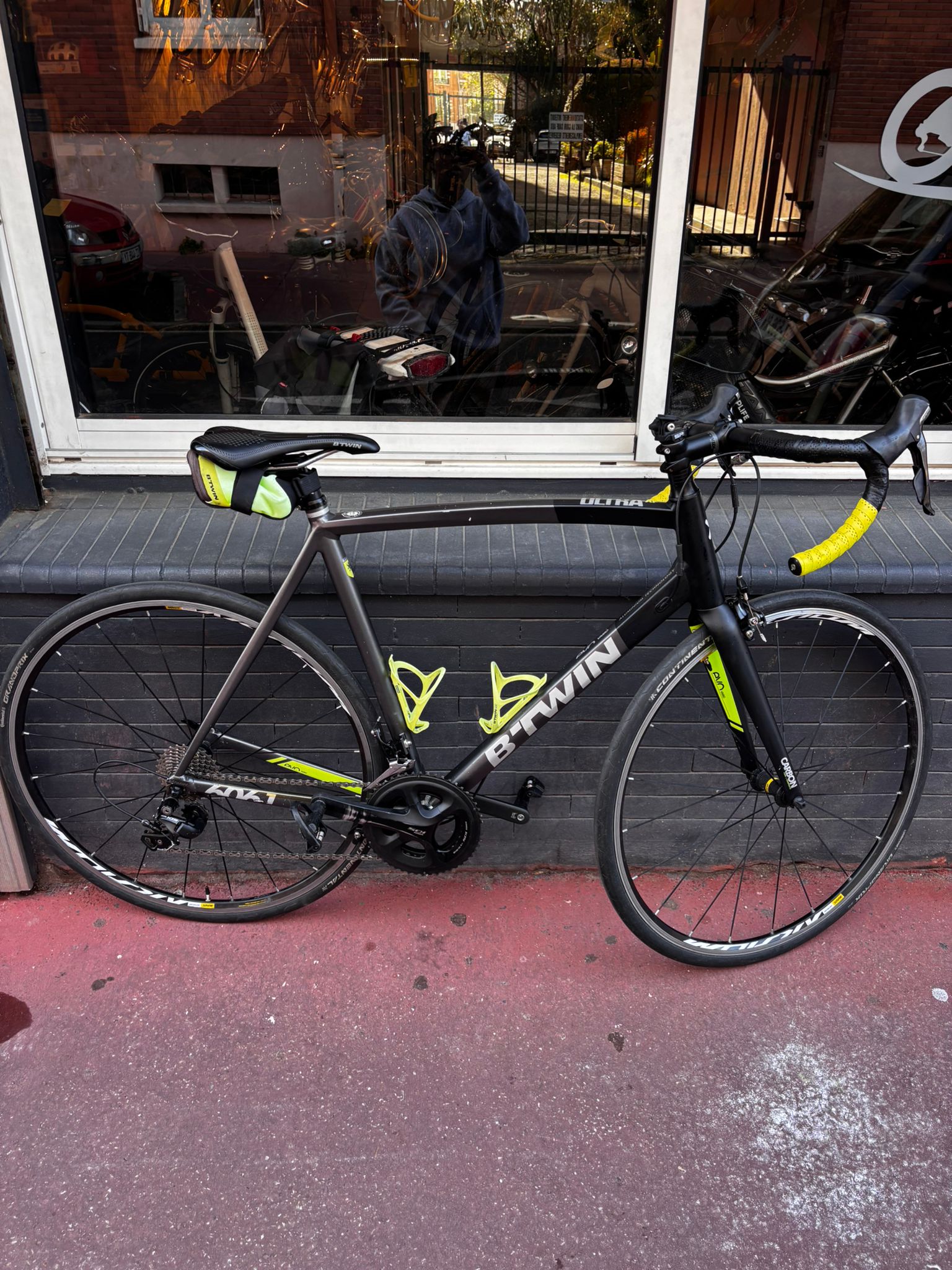 Vélo route B-TWIN Taille M Système de freinage et transmissions Shimano105, 11Vitesses a l’arrière et 2 Plateau avant, jantes Mavic, Pneu Continental (28-622)